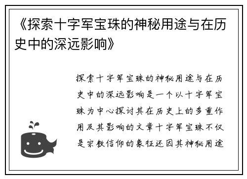 《探索十字军宝珠的神秘用途与在历史中的深远影响》