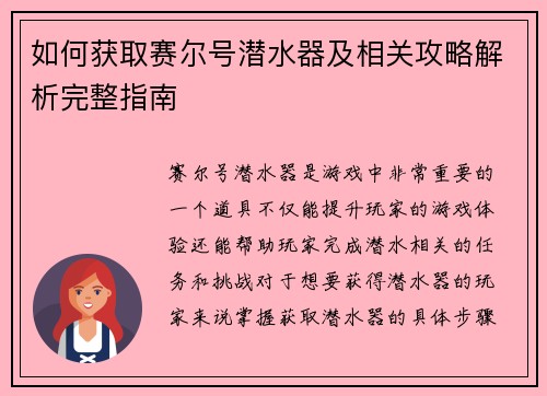 如何获取赛尔号潜水器及相关攻略解析完整指南
